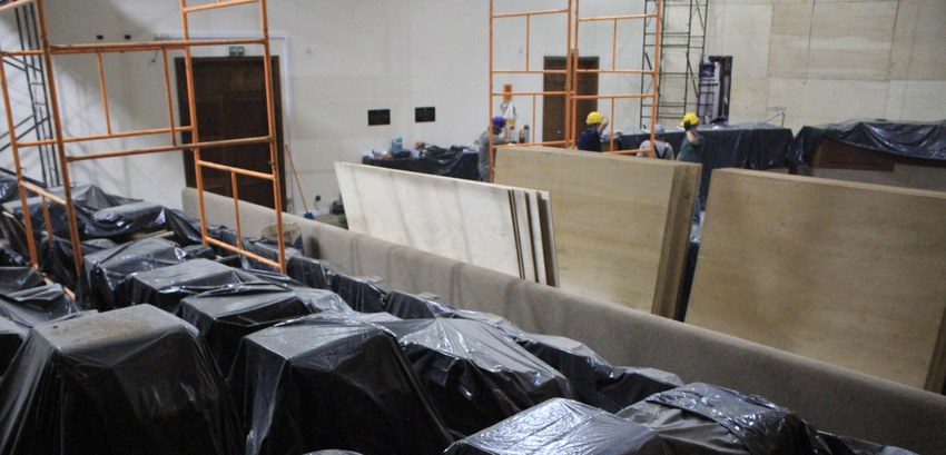 O TRE-RS está realizando obras de restauração em seu Plenário. As atividades começaram no dia 26 de dezembro do ano passado. Estão sendo feitas reparações na estrutura que reveste o ambiente, com o intuito de conservá-lo. Não haverá mudanças estéticas.